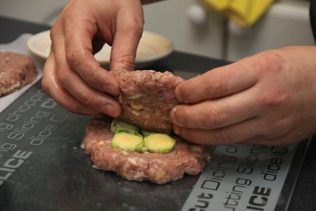 I pressed the sliced sprouts into the mix, lightly as to not make the mix to thin under the sprouts themselves... my girlfriend decided on stuffing hers with Mozzorella instead.....