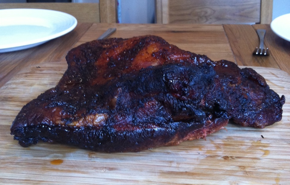It tasted great and was still full of juices when sliced but cant help thinking fat should have been trimmed more to give more uniform shape, plus i dont think i used enough hickory wood chips, they seemed to burn really fast.