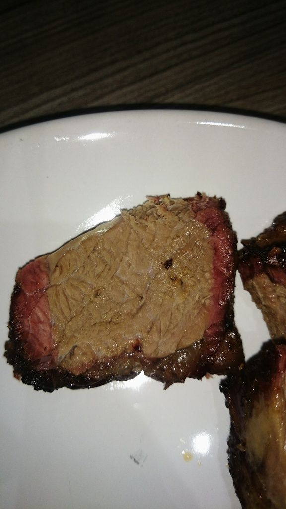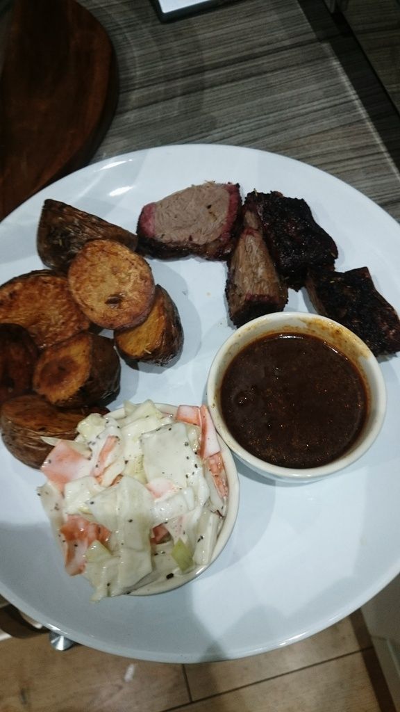 The temperature of the meat rose steadily for a few hours then stalled at 160f for about 3 hours - I hadn't planned on this. Once the temp hit 175 I wrapped the meat in foil for a further 2 hours and took it off at 190 and let it rest for a good 30 minutes. Whilst the meat was resting I made up a simple coleslaw of cabbage, onion, carrot, mayo, white vinegar, pepper and celery seeds. I then cut up a few spuds, covered then with olive oil and rosemary and out them in a cast iron pan and put on the bbq with the temp up about 400f for 35 minutes. The bbq sauce I made didn't really hit the spot so had to turn to bottled but overall a pleasant meal... Hadn't even heard of beef ribs till I went to the butcher the other day.