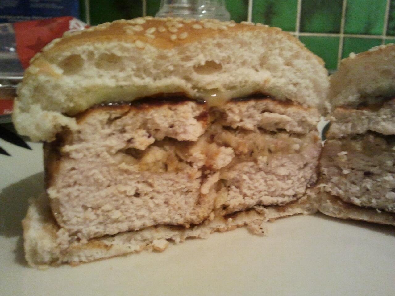 and finally, an uncut Burger... here you can se how thick they are. The burger sections couldve been slightly thinner to make the whole thing not so thick, but cooked slowly, this didnt seem to matter.......