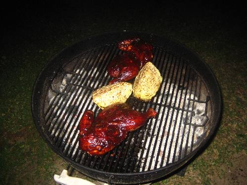 Well two halves really, while most of you were in you were a bed, I was busy at the grill. Chicken cut in half, seasoned with home mixed Butt Rub and coated with BBQ sauce. Cabbages have been on sale this week and have been so cheap so I thought it time to try some on the grill. As the grill was all hotted up I chopped up some potatoes and dropped them on as well - dinner for two cooked on the Kettle!!