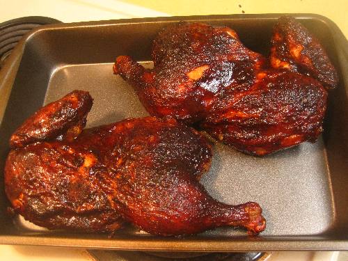 Chicken was pretty darn good, I have cooked lots of halved chickens now and have pretty much got it cracked, just like to play with different flavors, the Butt Rub gives it a bit of kick which sort of sneaks up on you after the sweetness of the BBQ sauce, the sauce was a mix of the two in the picture, they having been lurking in the fridge for a while and need using up.