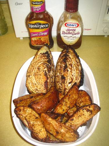 The cabbage was a new one for me, cooked naked on the grill ( the cabbage not me!!) Salt and pepper with a wipe over of Italian Dressing, the bottom got well charred and was lost to the cause, turned out crisp to the bite which makes a change to soggy boiled stuff, would recommend using a Savoy Cabbage so that the dressing can seep into the folds between the leaves. The Cabbage I had was so tight that nothing stood a chance of getting inside - will try wrapping it in foil next time.