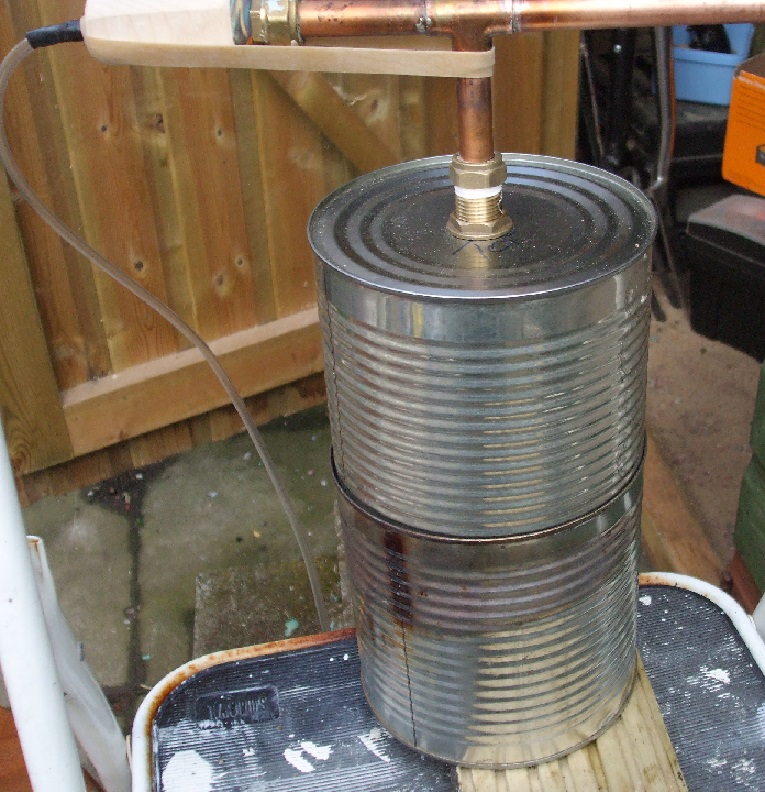 I found the centre of the upper tin and drilled a hole to accept a fitting thats used for connecting 15mm dia. pipe to water butts etc. Then attached a small pipe to this and a 'T-Piece, and then two small pipes to the other two ends. On the shorter of the two pipes I attached a pre drilled 'end piece. The holw was 6mm dia. - ready to accept a 6mm 'air pipe'. Then I cut a piece of 6mm (metel) pipe so that there was enough length for it to extend from just past the 't-piece' vertical hole and out far enough so as to enable a piece of plastic tubeing to be attached. To seal and hold the 6mm in place I drilled a piece of 26mm square wood and glued it to the pipe.